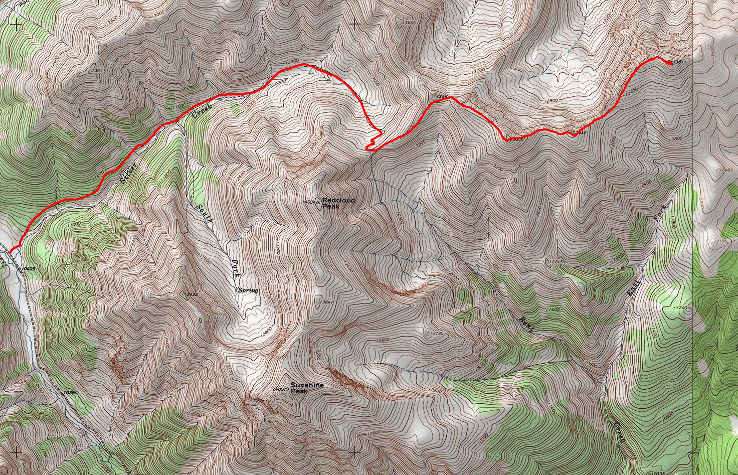 We followed the description provided by Gerry Roach's awesome 13ers book and found the end of the Cuba Gulch trail right before a huge open area of willows. We knew that from that area we'd need to navigate ourselves up a slope to the east following game trails. I opened up my topo map that I had borrowed from my dad and verified our position based on our surroundings and formulated a plan.
